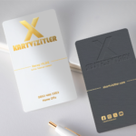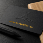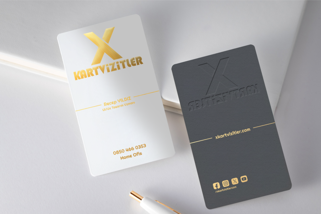 Fantazi Dikey Kabartma Kartvizit – Altın Yaldızlı ve Açık Gri Zemin Tasarımı