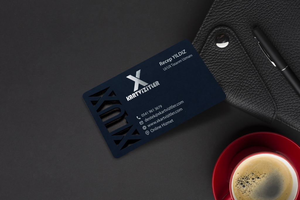 Fantazi Dikey Lacivert Kartvizit – Lazer Kesim ve Gümüş Yaldız Detayları