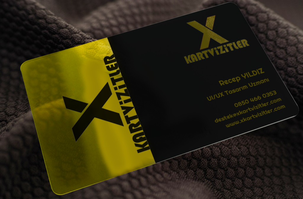 Şeffaf Kartvizit – Sarı ve Siyah Zeminli, 500 Mikron Oval Kesim